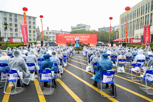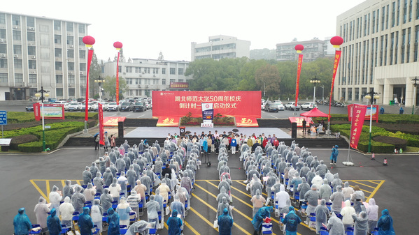 校党委书记李宏,校长雷儒金,原校领导、中国当代著名寓言大师黄瑞云教授,校友代表文学院96届校友、黄石二中党委副书记、校长周学君共同为50周年校庆倒计时牌揭幕。